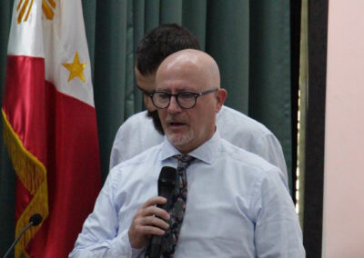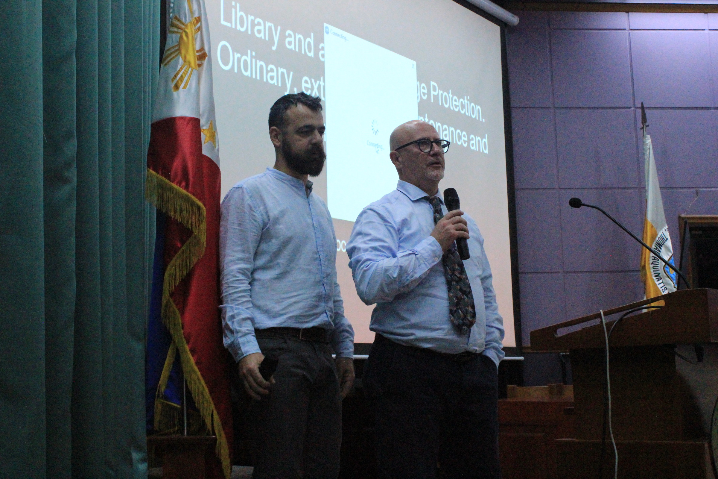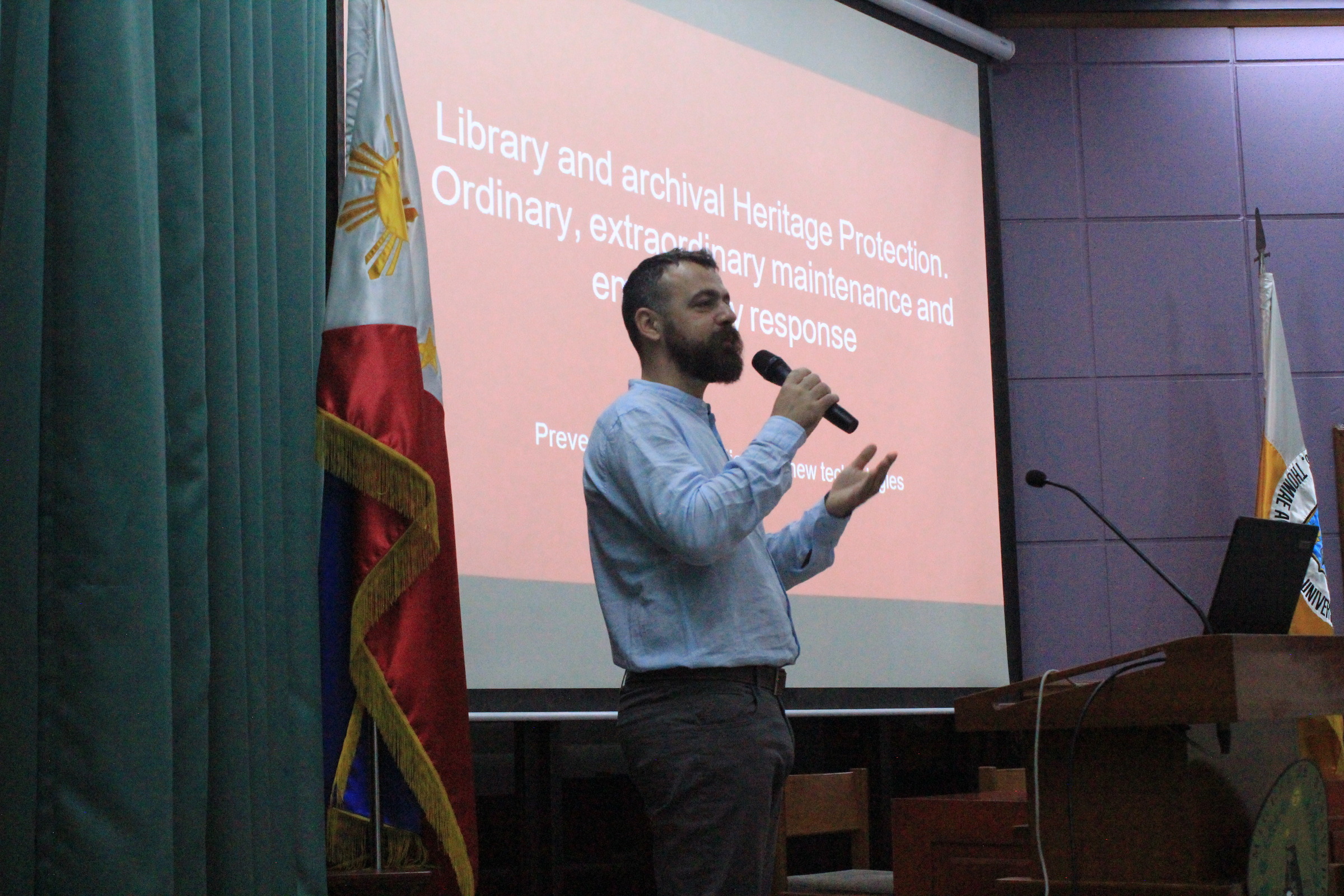 All’indomani del training, Pietro – uno dei massimi esperti al mondo di prevenzione, gestione delle emergenze e tecnologie per il recupero e il salvataggio di beni archivistici, librari e documentari – e Davide hanno partecipato in qualità di relatori a una delle sessioni formative e divulgative organizzate dall’Università di Santo Tomás in occasione delle celebrazioni e degli eventi organizzati per il 2024 in occasione del Mese del Patrimonio Nazionale.